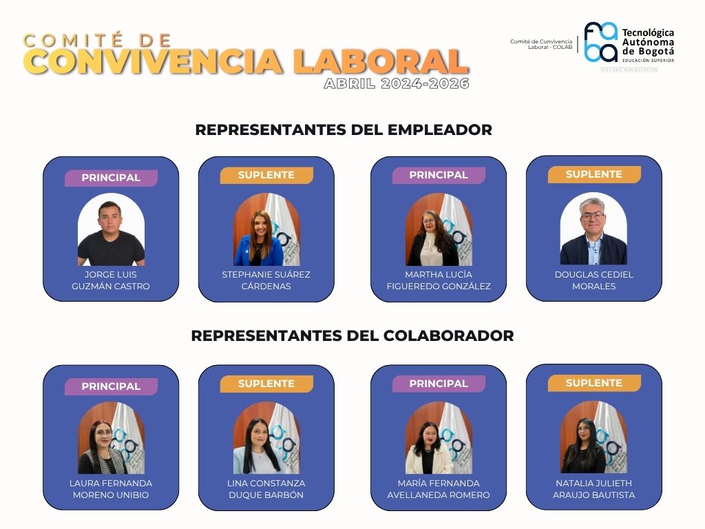El Comité de convivencia laboral (COLAB) está conformado por un grupo de Colaboradores de la Institución. La mitad de estos integrantes designados por el Empleador y la mitad restante elegidos por medio de votación por los Colaboradores. Su finalidad principal es promover en la Institución un ambiente libre de acoso laboral y/o acoso sexual laboral, por medio de diversas actividades de promoción.