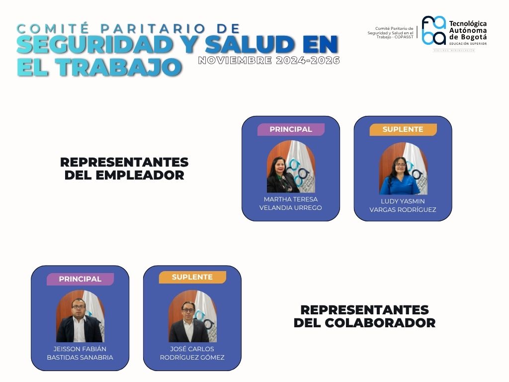 El Comité paritario de seguridad y salud en el trabajo (COPASST) está conformado por un grupo de Colaboradores de la Institución. La mitad de estos integrantes designados por el Empleador y la mitad restante elegidos por medio de votación por los Colaboradores. Su finalidad principal es promover espacios de trabajo seguros en la Institución, por medio de inspecciones de seguridad, actividades de promoción y prevención, entre otras.